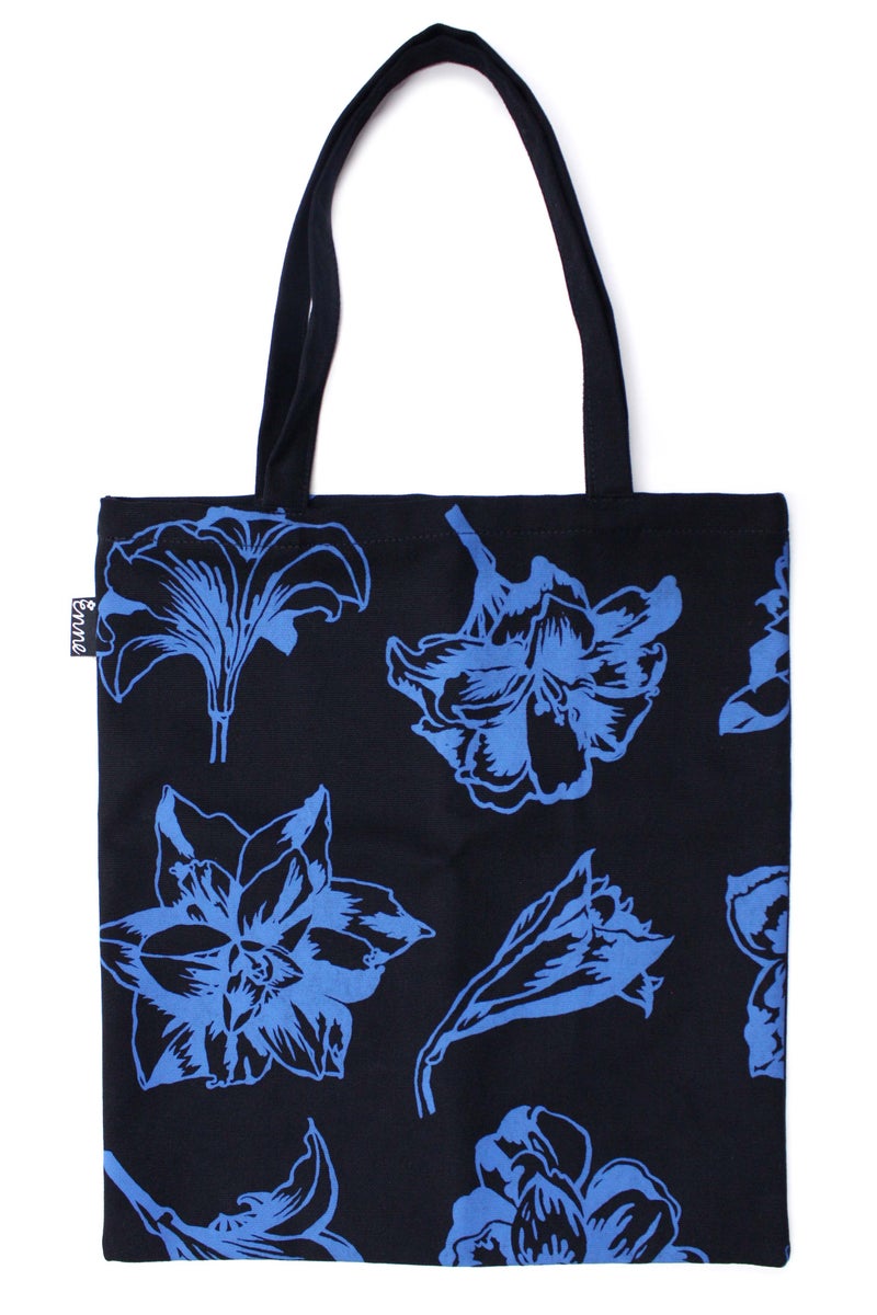 Kassit on painettu käsin luomupuuvillalle ja valmistettu kokonaan Suomessa. Kassin molemmilla puolilla on Amaryllis-kuosi.